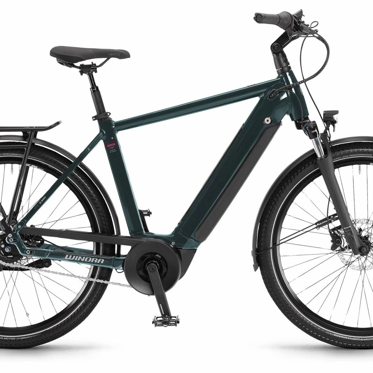 Das Winora Sinus N8f ist ausgestattet mit einer 8-Gang Shimano Nexus Nabenschaltung mit Freilauffunktion, einem Bosch Active Plus 50Nm Motor mit leistungsstarkem 500Wh Akku und einer SR Suntour NEX E25 Federgabel.