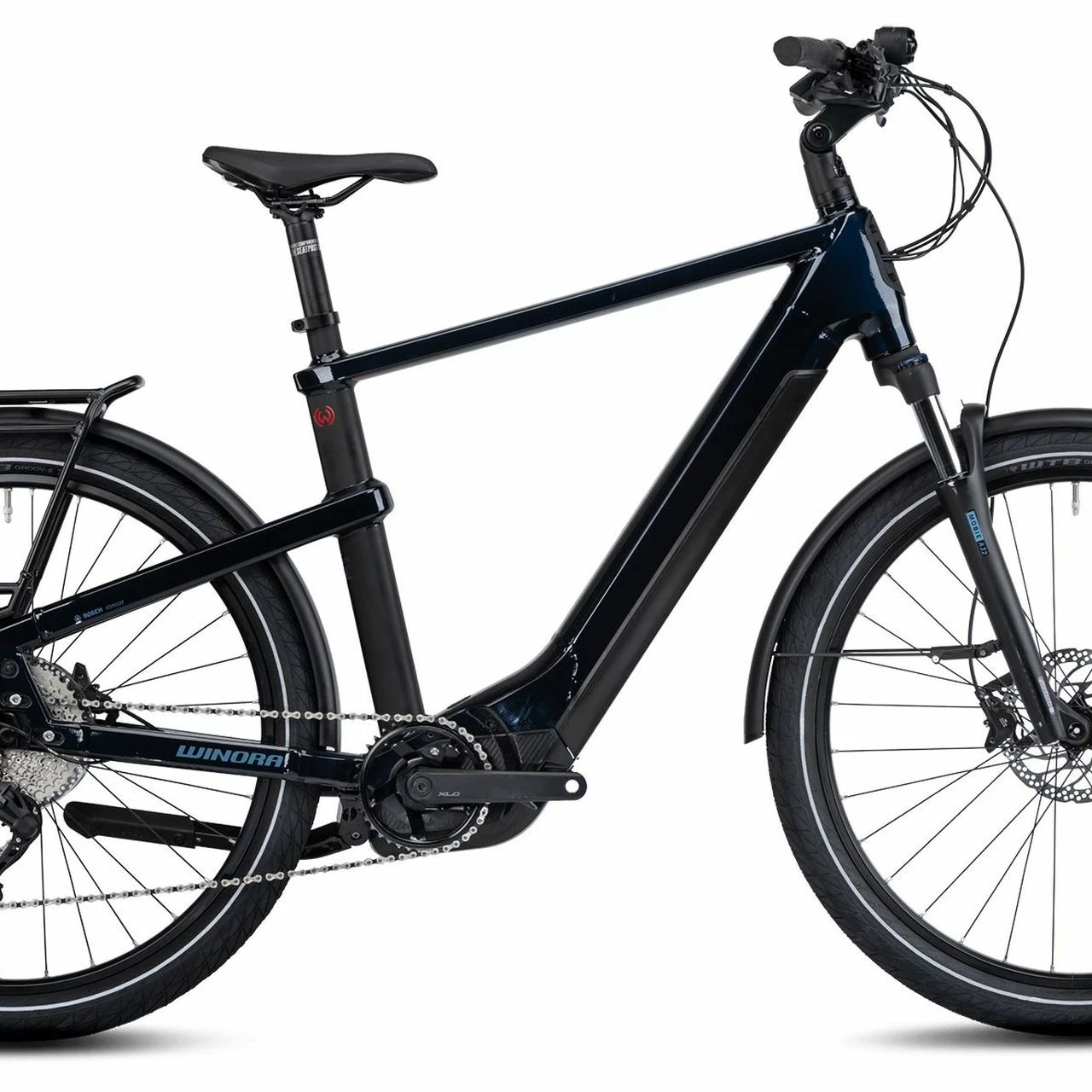 Das Winora Yakun 10 750Wh Bosch Elektro Trekking Bike 2022 ist ausgestattet mit einer 10-Gang Shimano Deore Kettenschaltung, einem Bosch Performance CX Smart System 85Nm Motor mit leistungsstarkem 750Wh Akku und einer SR Suntour Mobie A32 Federgabel.